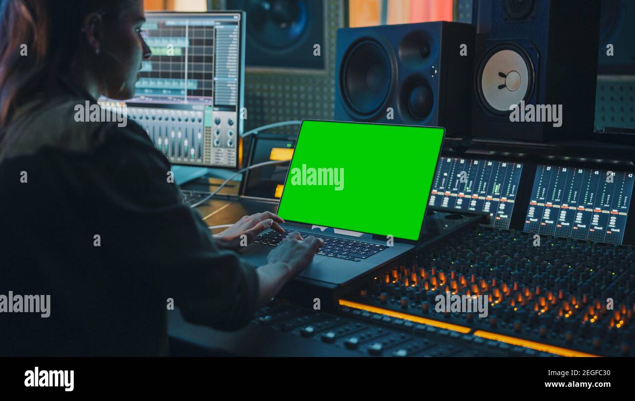 Female Artist Musician Producer Audio Engineer Working In Music Record Studio On A New Album Use Green Screen Laptop Computer Control Desk For Stock Photo Alamy