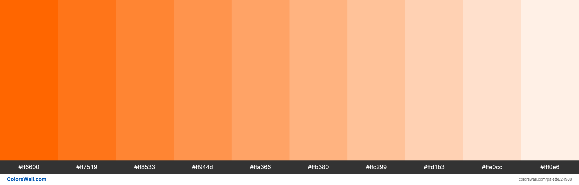 Colorswall On Twitter Tints Of Safety Orange Color Ff6600 Hex Ff6600 Ff7519 Ff8533 Ff944d Ffa366 Ffb380 Ffc299 Ffd1b3 Ffe0cc Fff0e6 Colors Palette Https T Co Xsu8ne4hgg Https T Co Ffq9duhps8 Twitter